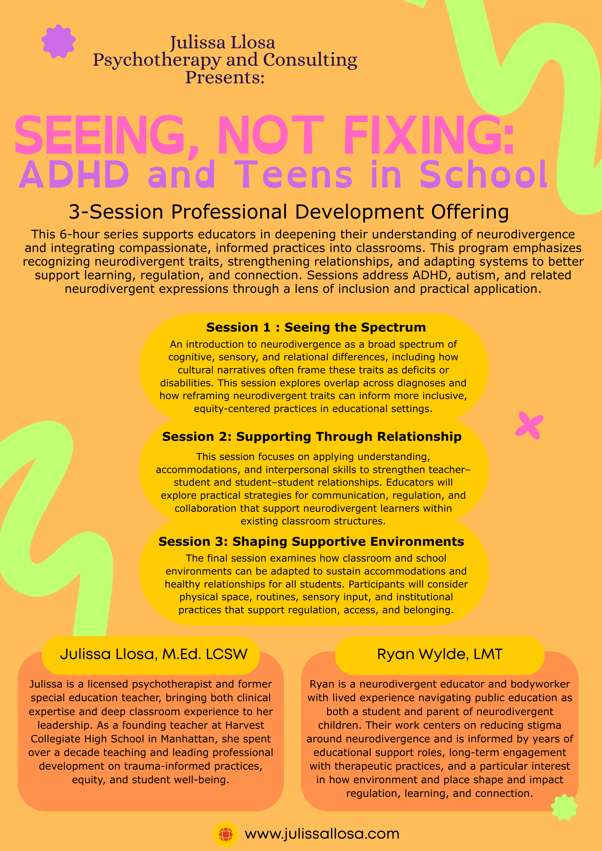 With over 15 years of experience as an educator and therapist, I guide schools and organizations toward inclusive, trauma-informed, and resilience-focused practices. I lead professional development and workshops on neurodivergence, decolonizing education, and trauma-informed teaching, and also facilitate support groups for neurodivergent individuals.